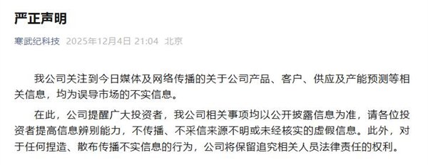 寒武纪表示,传闻公司关注到今日媒体及网络传播的不实关于公司产品、客户、供应及产能预测等相关信息,均为误导市场的不实信息。